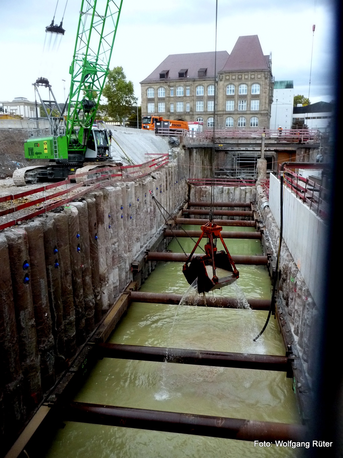 Aus dem gefuteten Nesenbachkanal zwichen Planetarium und Ferdinand-Leitner-Steg wird ausgebaggert