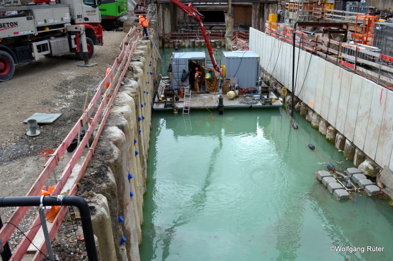Nesenbachdüker-Baustelle: Betonieren der Kanalsohle unter Wasser hat bekonnen