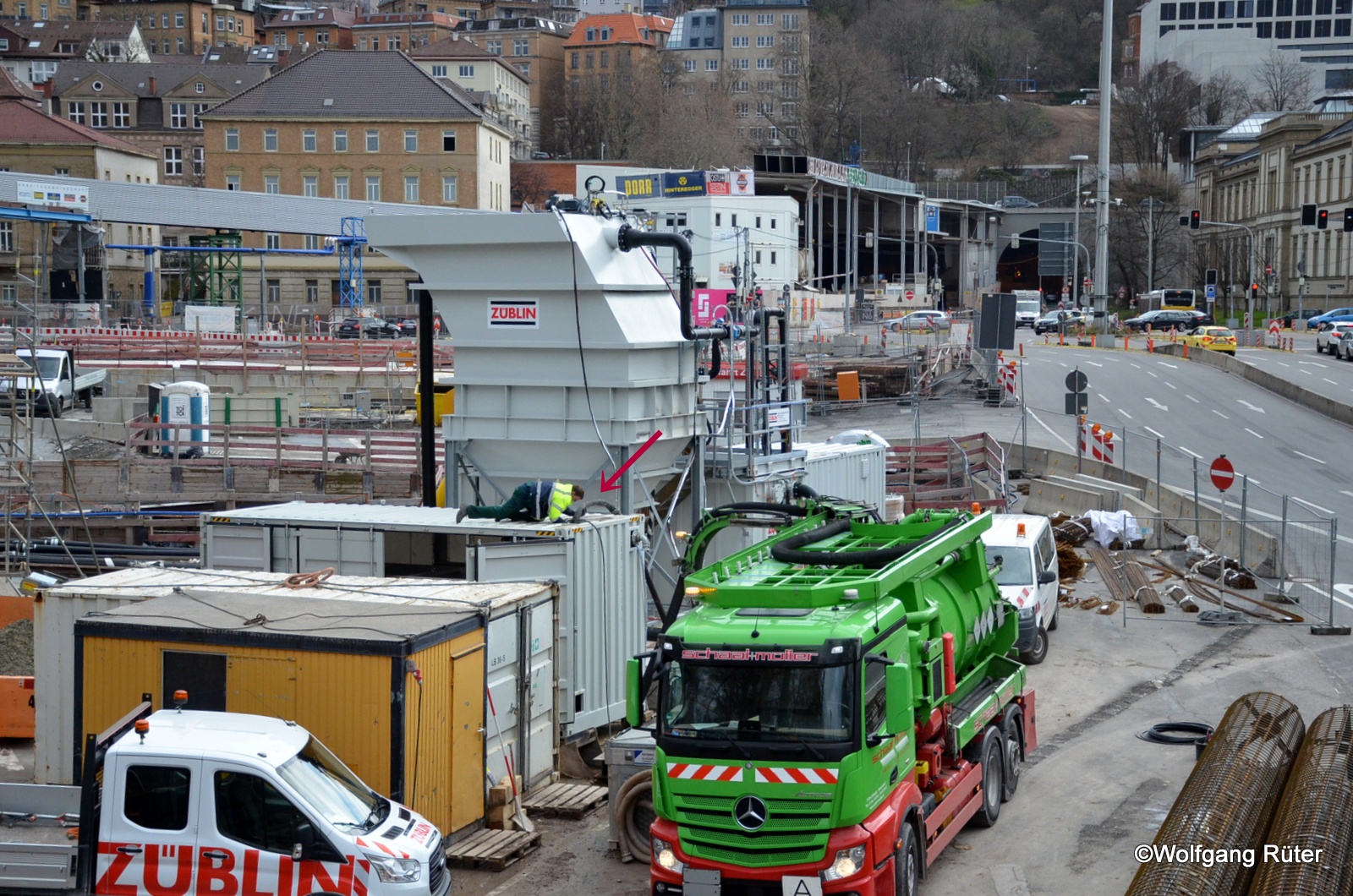 Ein Fahrzeug der Entsorgungsfirma Schaal u. Müller saugt Schlammreste aus der (verstopften?) Umweltanlage von Züblin zum Reinigen von Baugrubenwasser ab
