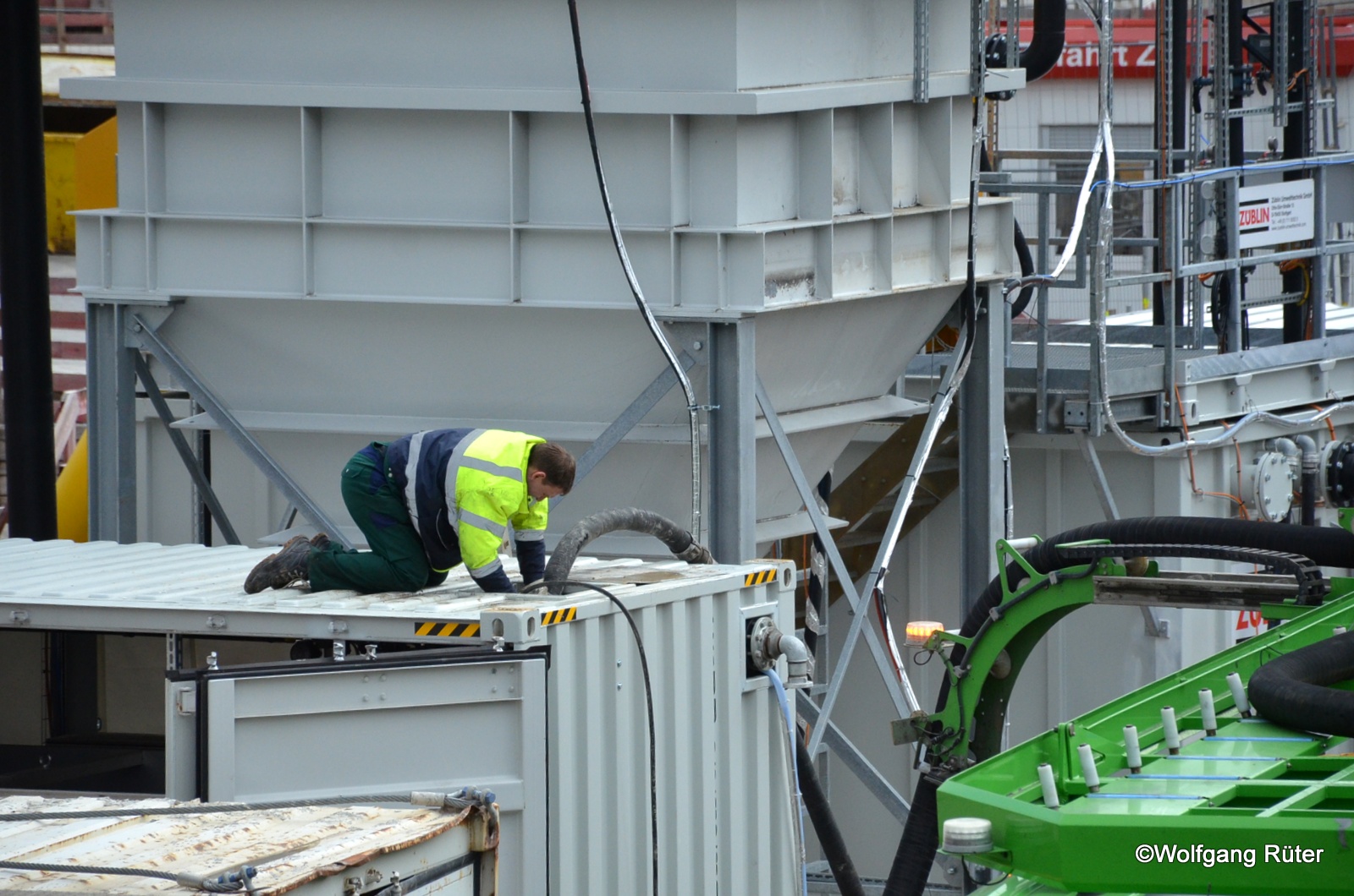 Ein Fahrzeug der Entsorgungsfirma Schaal u. Müller saugt Schlammreste aus der (verstopften?) Umweltanlage von Züblin zum Reinigen von Baugrubenwasser ab