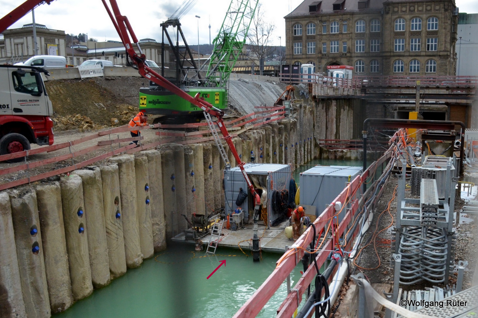 Ein Industrietaucher befindet sich wahrend des Betonierens unter Wasser. Der Pfeil weist auf die schwarz-rot-gelben Versorgungsschläuche für den Taucher