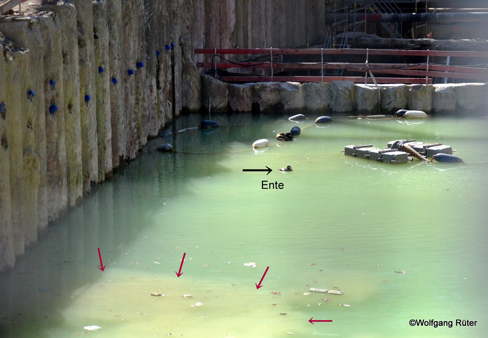 Im Vordergrund das durch Arbeiten unter Wasser hervorgerufene lehmig-braun verfärbte Wasser
