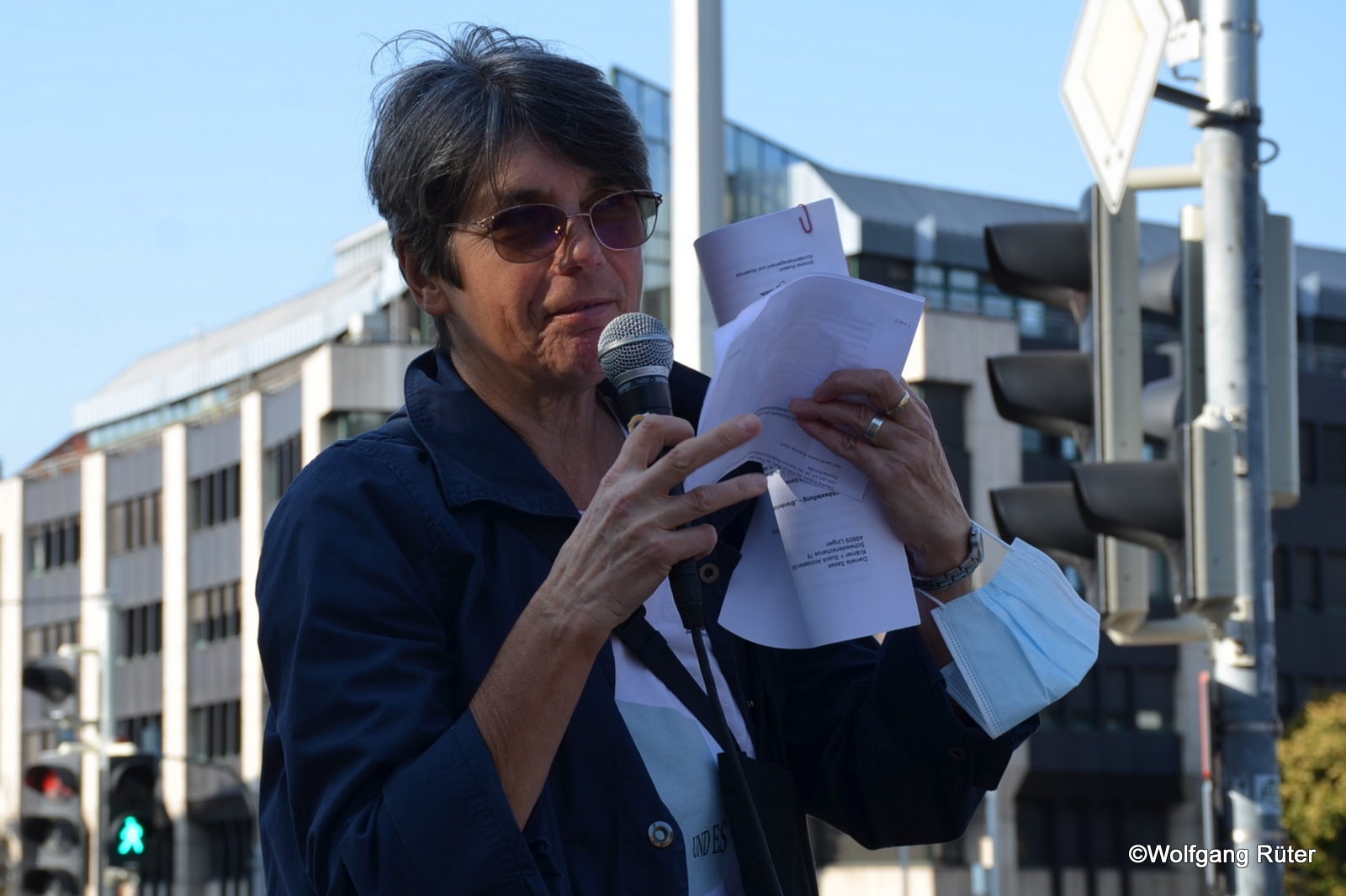 Friederike Votteler (Naturfreunde Stuttgart / FUSS e. V. Stuttgart)auf dem Wilhelmsplatz bei einer Zwischen-Kundgebung