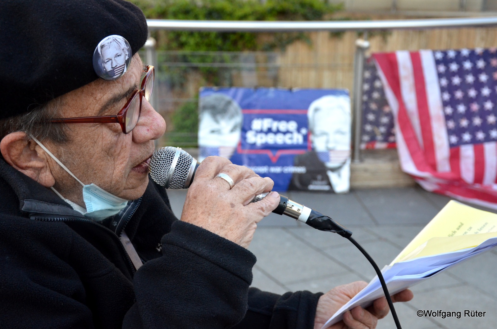 Ein Mitstreiter der Mahnwache "Freiheit für Julian Assande" gibt aktuelle Informationen bekannt