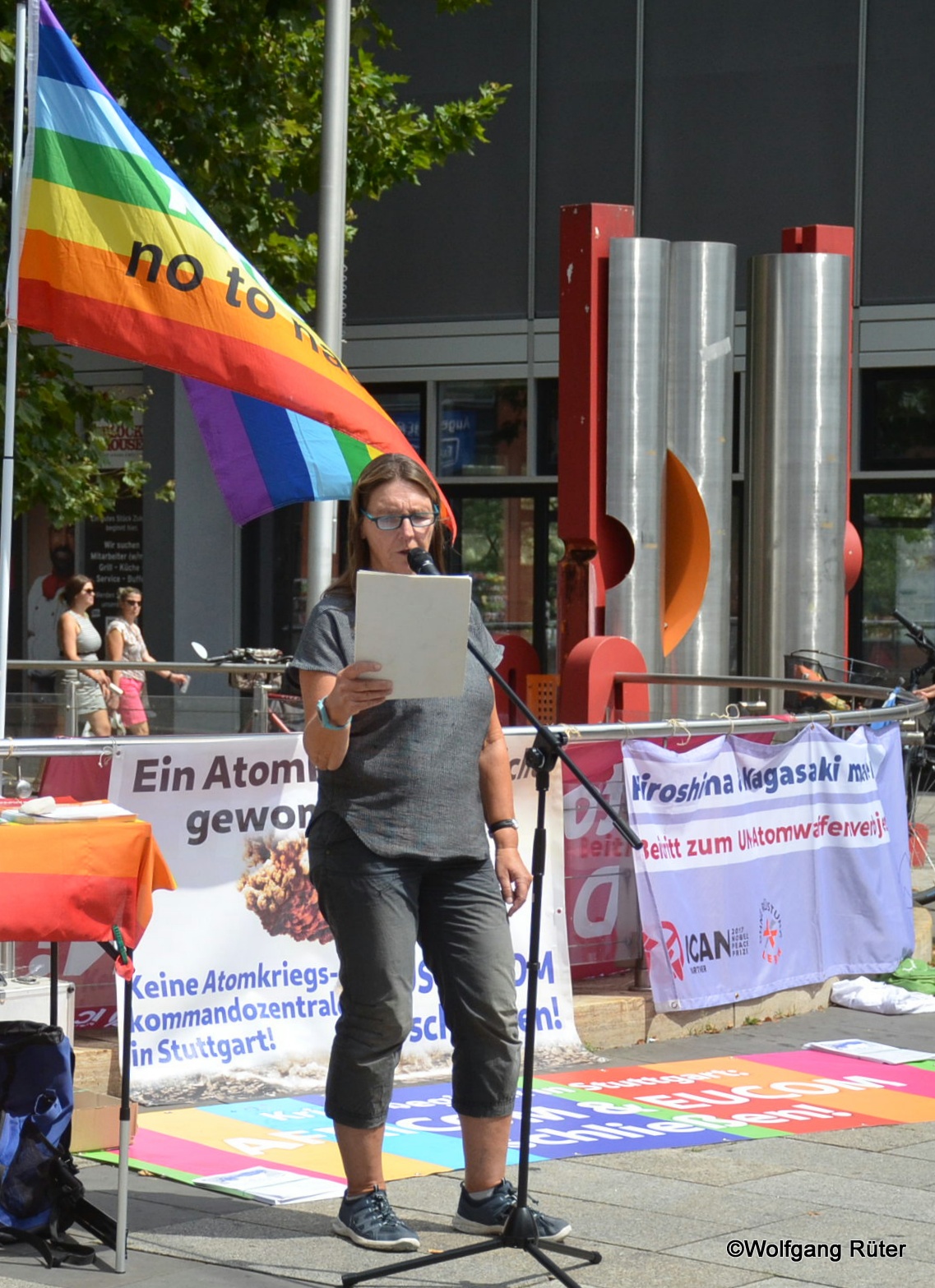 Susanne Bödecker (Bezirksbeirätin in Zuffenhausen für Die FrAKTION LINKE SÖS PIRATEN) hält ihren Redebeitrag