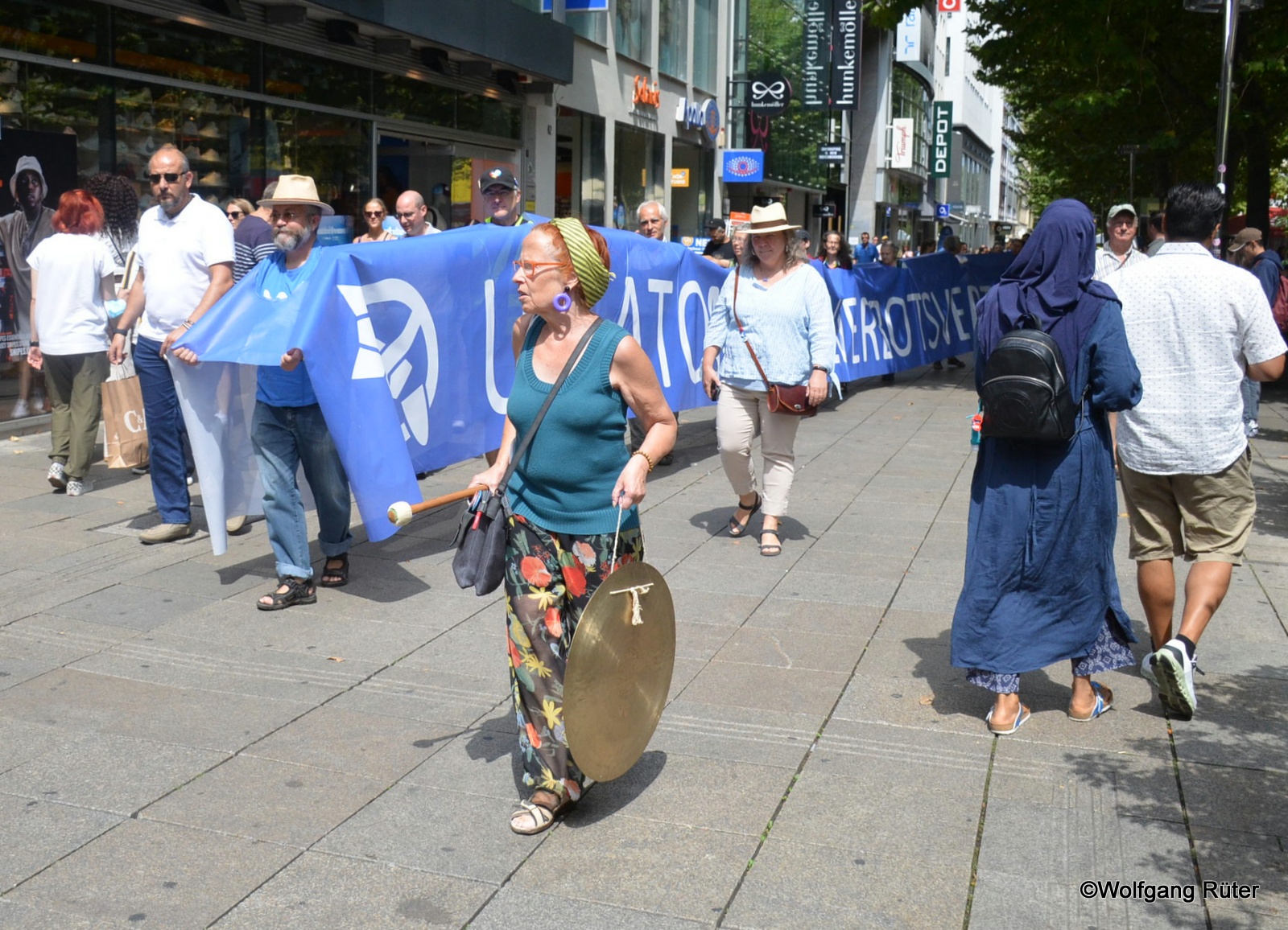 Mit Gong und mit dem Friedens-Lindwurm-Banner wird auf der Königstraße auf den 77. Jahrestag des Atombombenabwurfs auf Hiroshima aufmerksam gemacht