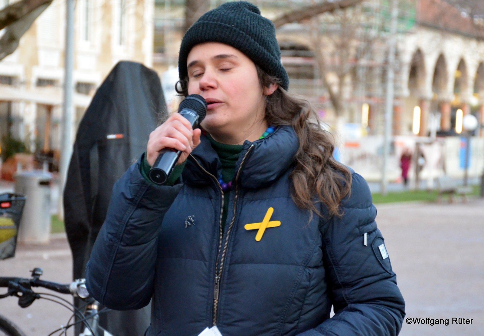 Sarah Bies trägt - in sich gewandt - zum Abschluss der Kundgebung ihr Gedicht zur aktuellen Lage der Geschehnisse vor