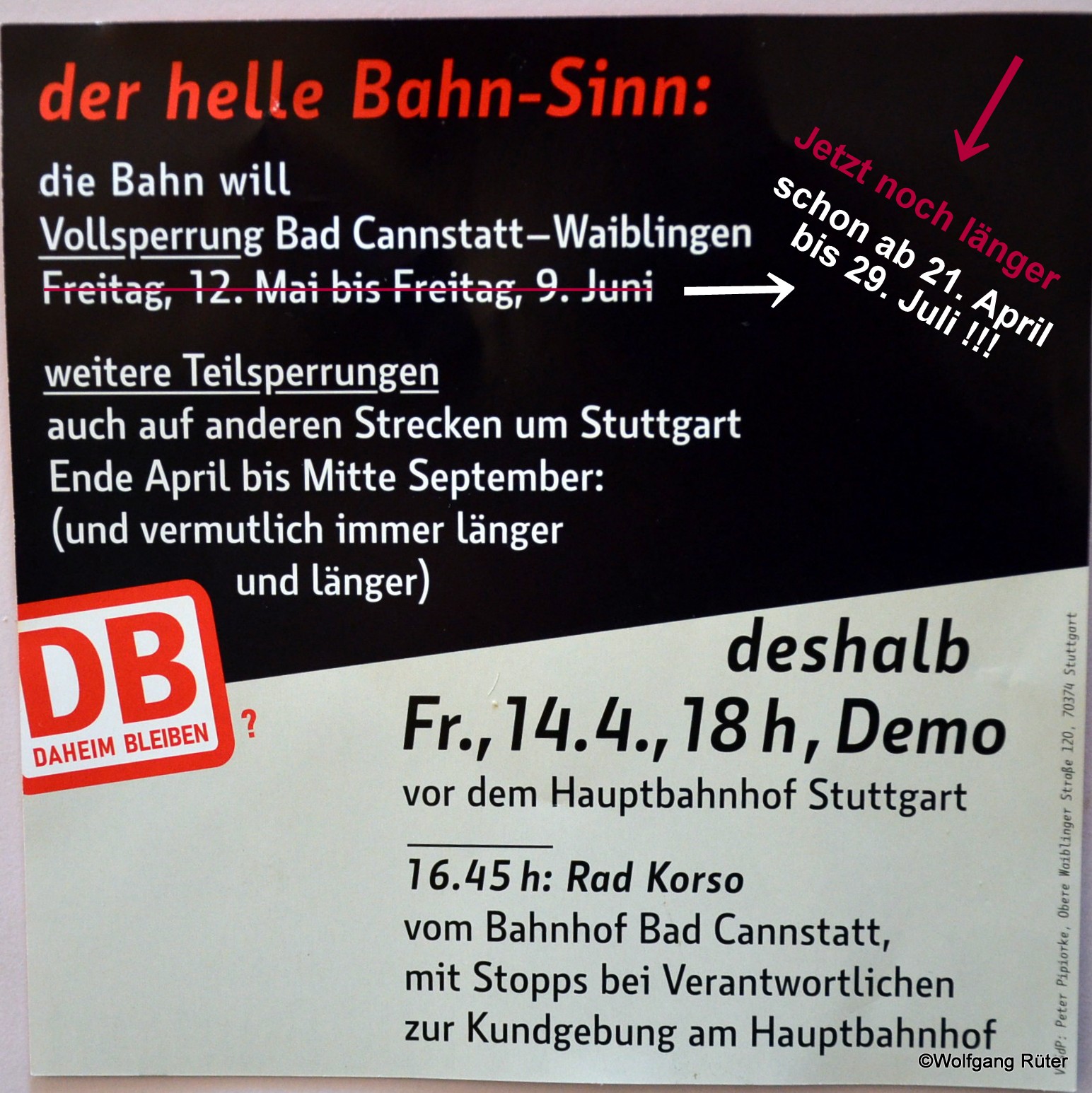 Flyer zum Aufruf der Demo. Nach Drucklegung des Flyers wurde die Dauer der Streckensperrung weiter ausgedehnt