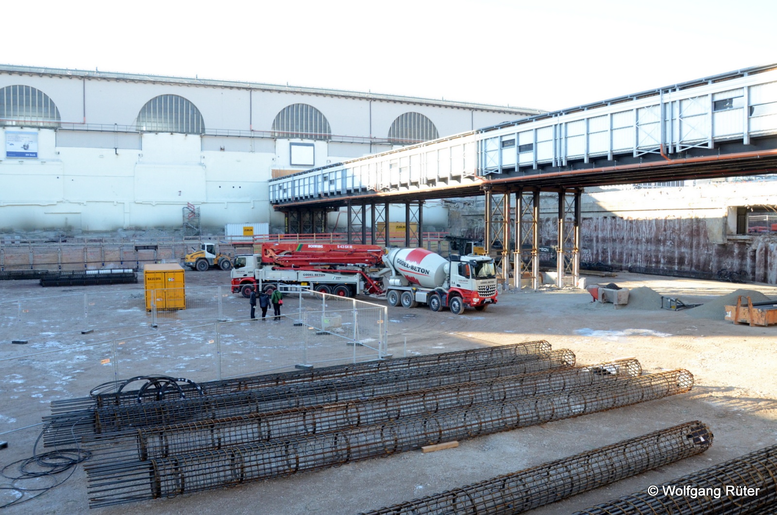 Baugrube 12 und 13 im Trog unter den beiden Fußgängerstegen zu den Bahnsteigen
