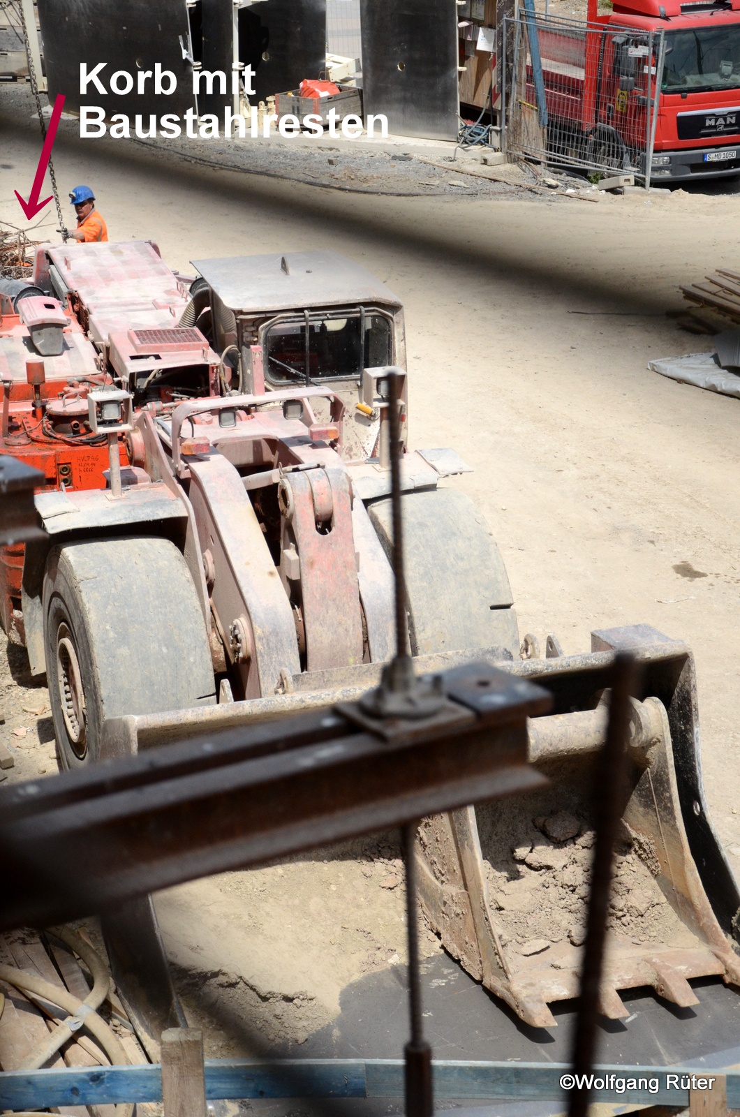 Ein Bauarbeiter kettet einen Transportbehälter mit Baustahlresten an das Kranseil an