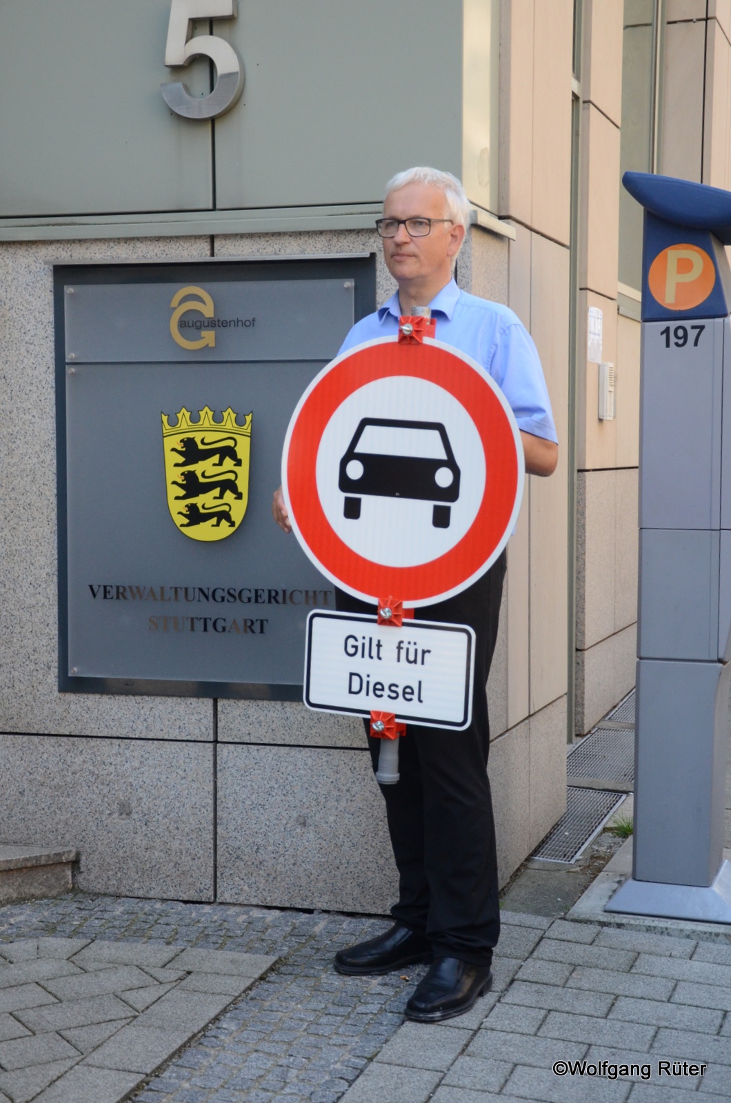 Jürgen Resch, Bundesgeschäftsführer der Deutschen Umwelthilfe, zeigt vor dem Verwaltungsgericht in Stuttgart per Verkehrszeichen den Weg, wo es langgehen muss