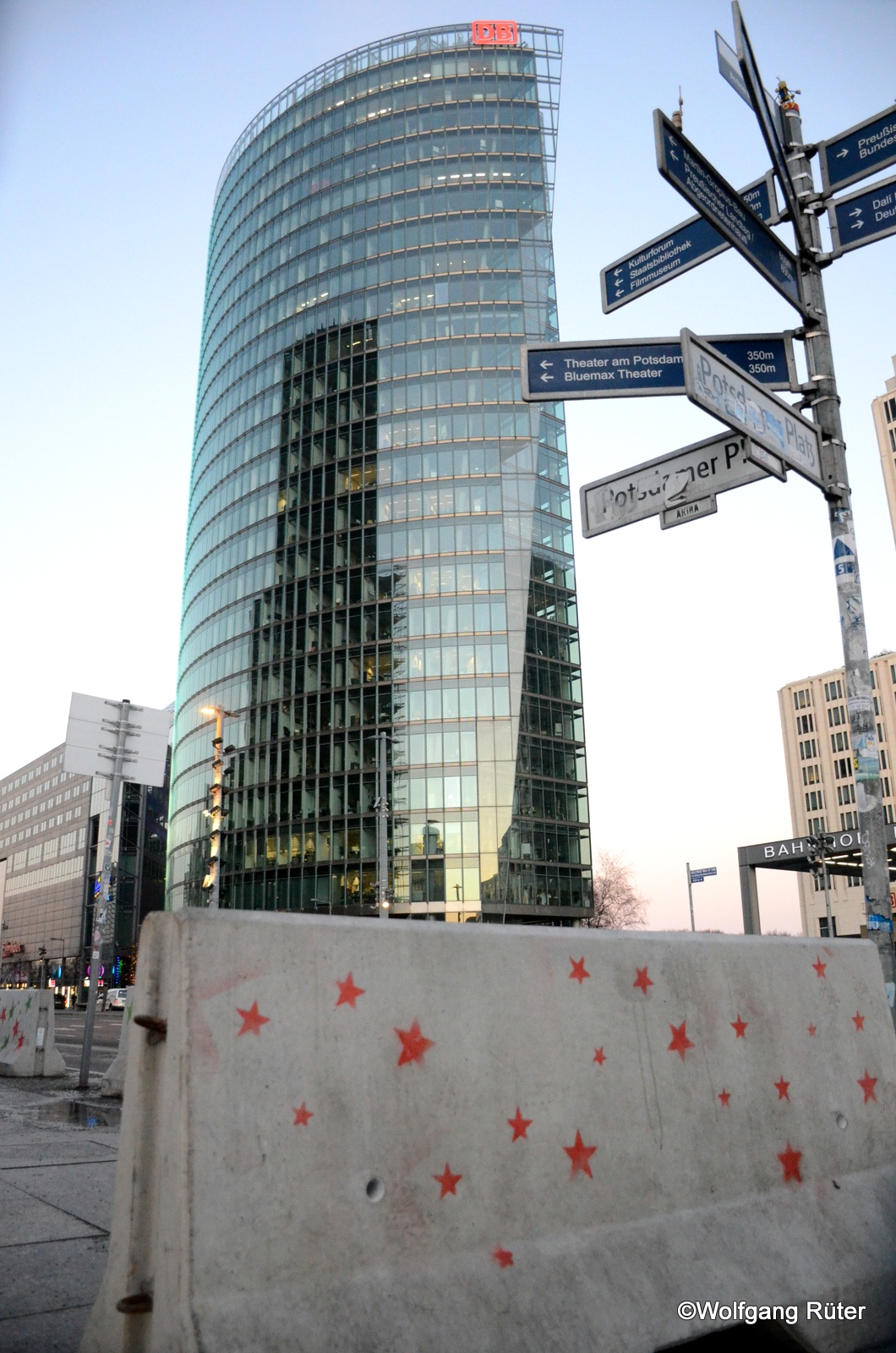 Weihnachtlich aufgehübschte Betonabsperrung mit DB-Tower