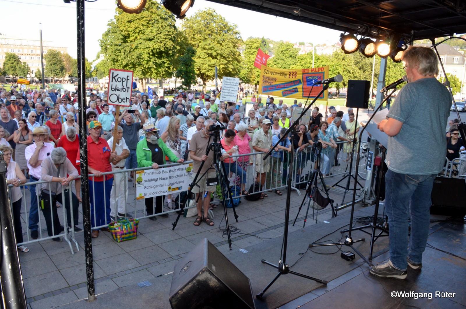 Michael Becker (Kernen 21), hier mit Blick auf die TeilnehmerInnen, moderierte die 429. Montagsdemo