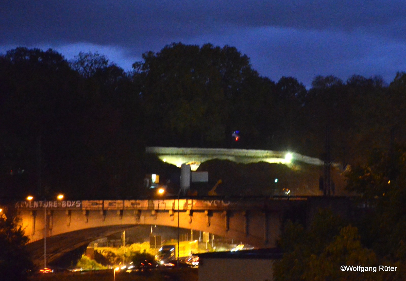Die S21-Tunnelportal-Baustelle wird bei einsetzender Dunkelheit ohne Rücksicht auf die Tierwelt mit Flutlicht erhellt
